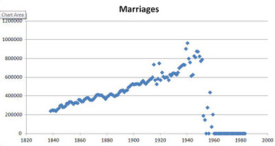 This graph shows the unique marriage statistics for England and Wales in FreeBMD year by year. Data only goes up to about 1950 so ignore anything after that.