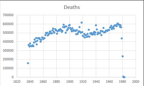 The influenza pandemic year 1918 holds the record for deaths. The exception to the trend of an increasing number of deaths with time, reflecting population increase, is the late 19th century to the early 1920s due to improved sanitation and health care.